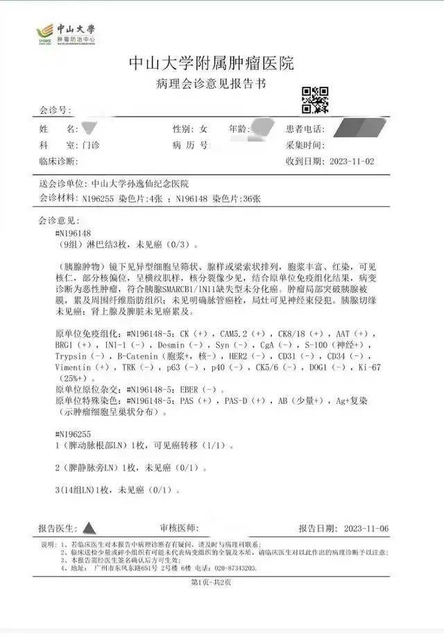 7日晚,相关人士蝶儿向齐鲁晚报·齐鲁壹点记者提供了一份病理报告的照片,蝶儿称该报告属于患病学生中的其中一人黄某,即爆料中所说患胰腺癌转移的当事人。照片显示,病理报告出具于11月2日,病人为黄某,今年29岁,出诊机构为中山大学附属肿瘤医院,临床诊断一栏中写道:“病变符合恶性肿瘤,考虑为胰腺癌转移”。