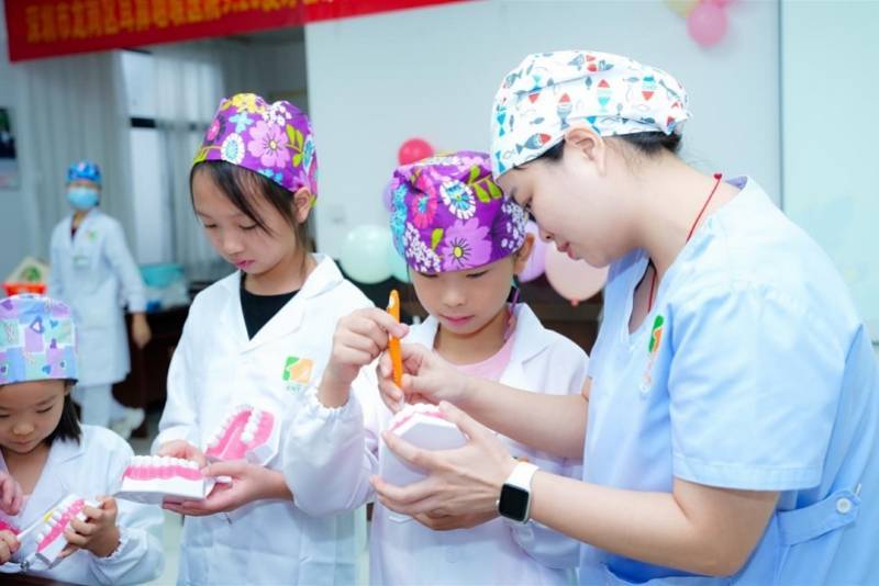50名少先队员在深圳市龙岗区耳鼻咽喉医院学习了解青少年常见龋齿的预防处理、窝沟封闭以及牙外伤的处理等口腔健康知识后,分组分别饰演“牙医”和“伤者”,体验“小牙医”在面对突发牙外伤牙断裂等情况时进行安全处理的方法,沉浸式感受牙科就医看诊过程。引导少先队员树立早预防、早发现、早诊断、早治疗、早受益的口腔保健理念,提高少先队员的口腔健康素养。