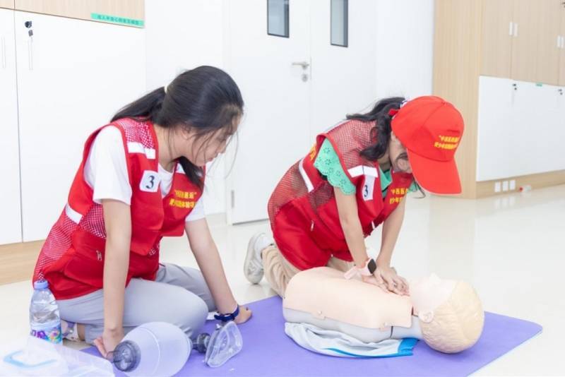 少先队员分组进行急救知识培训,在分娩演示中观看体验模拟分娩过程及胎儿十月模型;在海姆立克法技能培训中学习方便易记的“剪刀石头布定位法”,详细区分了成人与婴儿使用“海姆立克”急救手法的区别;现场演练了心肺复苏操作技巧和流程以及正确使用AED步骤;进行模型实际操作练习,将理论与实践相结合掌握创伤应急处理等急救技能,提升少先队员的应急救护知识水平。