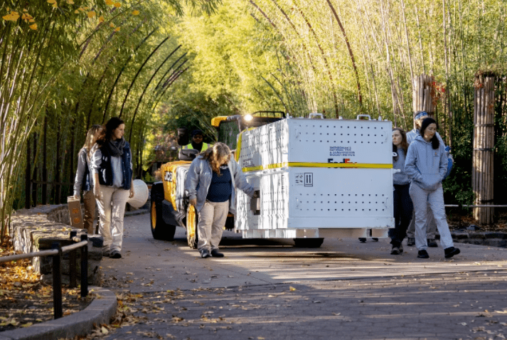 8日上午,华盛顿史密森学会国家动物园工作人员将三只装有大熊猫的特制“旅行包厢”、220磅(约合100公斤)竹子、饮用水及相关物资运上卡车。随后,载有“美香”“添添”和“小奇迹”的车队驶离动物园,前往华盛顿杜勒斯国际机场。
