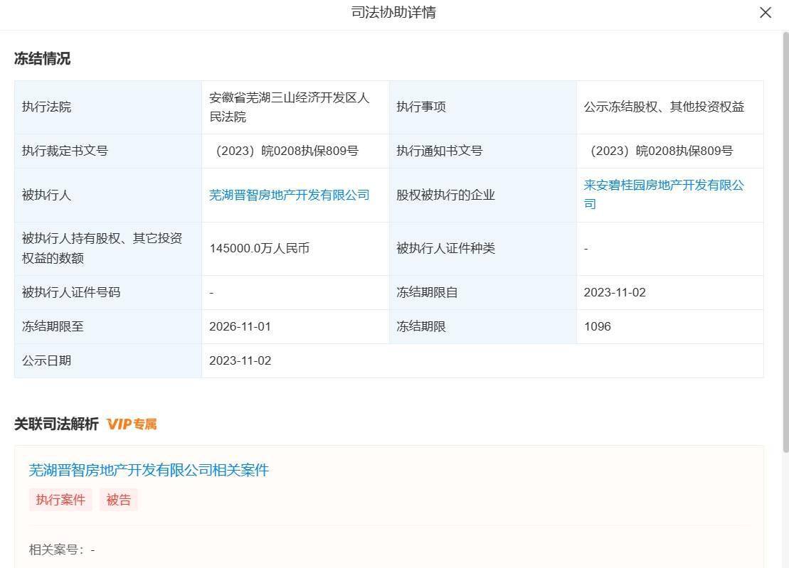 三言科技 11月9日消息,天眼查App显示,近日,芜湖晋智房地产开发有限公司新增一则股权冻结信息,冻结股权数额14.5亿人民币,股权被执行的企业为来安碧桂园房地产开发有限公司,冻结期限自2023年11月2日至2026年11月1日,执行法院为安徽省芜湖三山经济开发区人民法院。