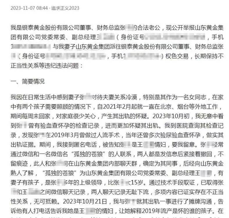 11月7日,网友“追求正义2023”在网上发布文章《举报山东黄金副总王某与银泰黄金财务总监张某长期不正当性关系》。文章称,自己是银泰黄金股份有限公司董事、财务总监张某的合法老公,现公开举报山东黄金集团有限公司党委常委、副总经理王某与山东黄金集团派驻银泰黄金股份有限公司董事、财务总监张某权色交易,长期保持不正当性关系等违纪违法问题。