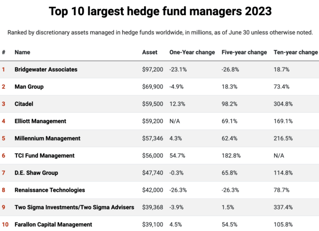 但在《养老金与投资》今年发布的2023年十大对冲基金名单中,桥水基金仍然是全球第一,其已经是第十四年拿下榜首了,但是截至今年6月30日,其资产规模却减少到了972亿美元,一年内缩水超23%。