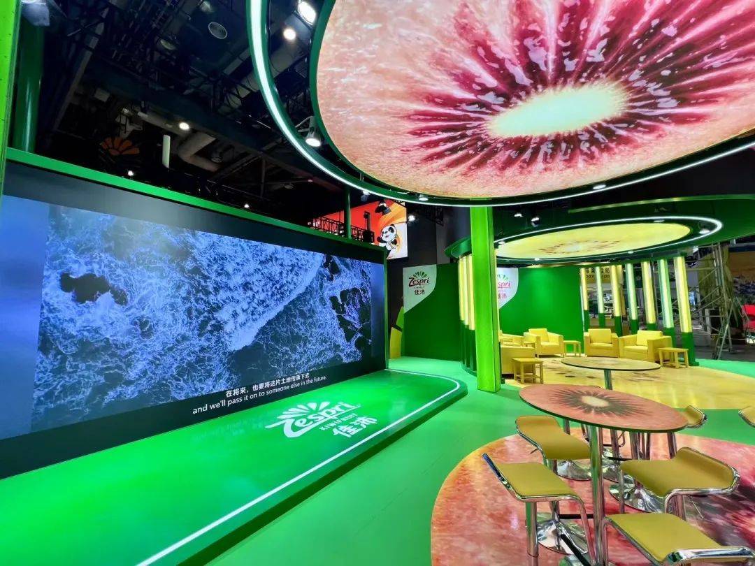 佳沛在本届进博会上还打造了一个碳中和展台,大量使用了环保可回收材料。金世理对其中的低碳环保理念进行解释:一方面,目前佳沛环保包装使用率已达88%,目标在2025年之前产品包装达到100%可回收或者可降解,同时在供应链中大幅减少塑料包装使用。另一方面,就是希望能到2030年达到零碳排放。