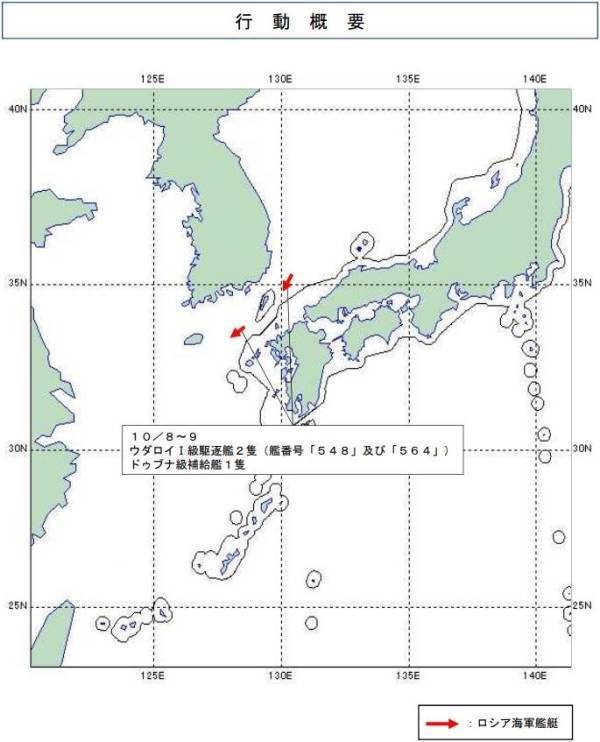 上月8-9日海上自卫队观测到的俄舰编队及行动路线 图片来源:日本防卫省统合幕僚监部