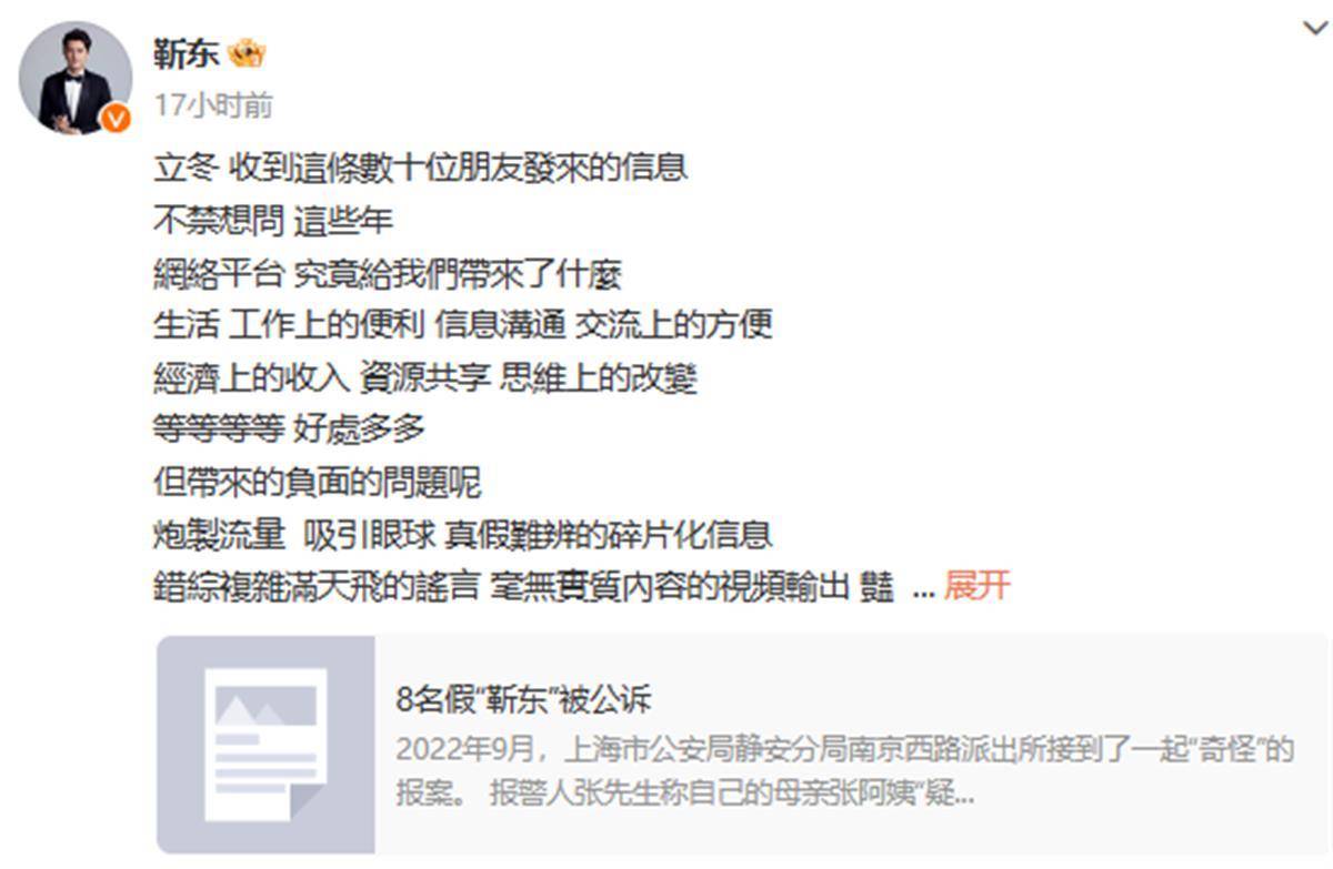 也因此,此次靳东的发声,更多了几分无奈和深思。他表示:“这是我们共同生活的社会问题,是一个不能只提出让我们的民众不轻信、不盲从、提高防骗能力,应该好好认真对待网络监管的问题,是起码要守住我们的底线的问题,是一个事关我们每一个人的问题。”这与他此前在案件侦办期间的发文,其实表达的是同一个意愿,就是希望有切实有效的措施,去实现对网络平台内容强有力的监管,督促网络平台去担负应有的责任,及时快速地处置这类有害信息,让这些“一眼假”的山寨明星信息销声匿迹,维护所有人的上网安全。