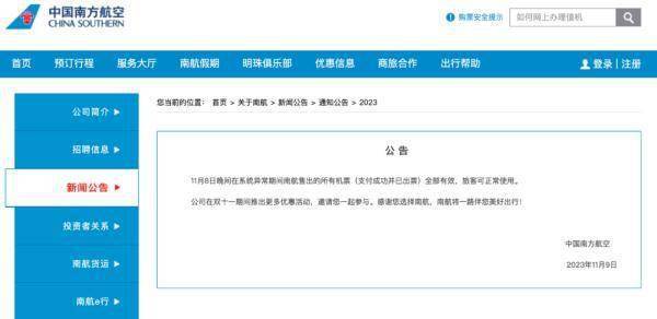 11月9日中午,中国南方航空发布公告:11月8日晚间在系统异常期间南航售出的所有机票(支付成功并已出票)全部有效,旅客可正常使用。