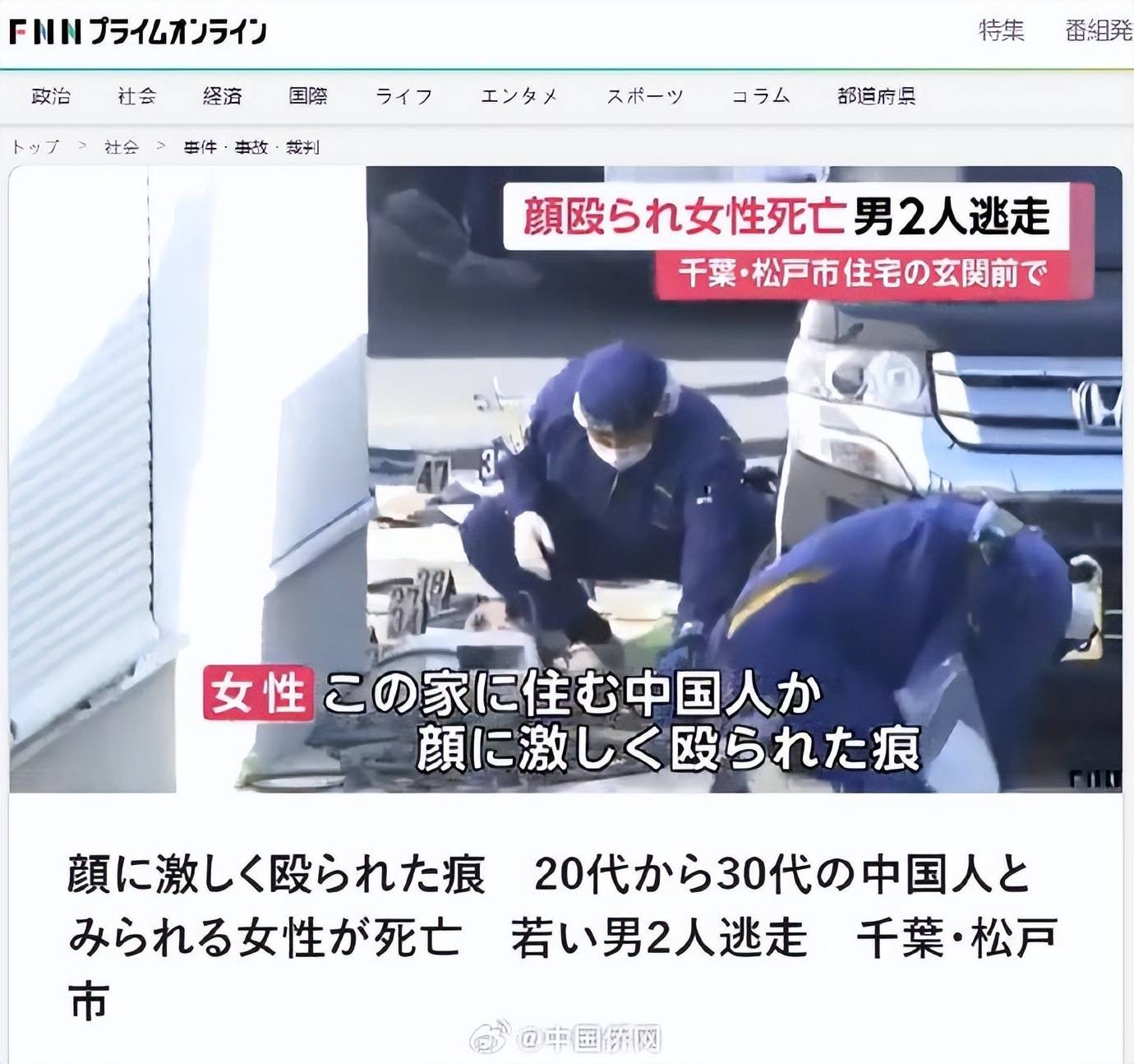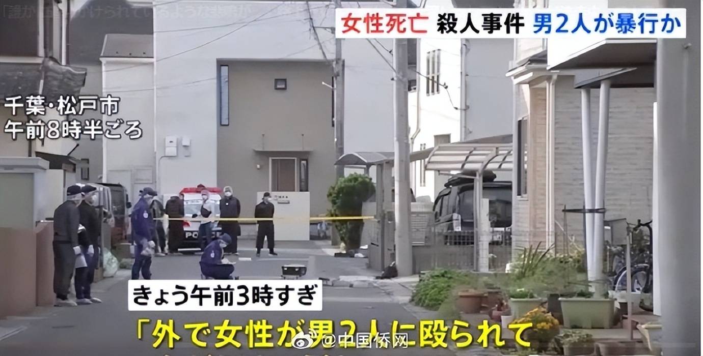 据中国侨网援引日本媒体报道,当地时间9日凌晨,日本千叶警方在千叶县松户市发现一名年轻女子面部流血倒在地上,在送医之后确认死亡。有当地目击者报警称,凌晨3点多,在松户市古崎的自家住宅内,“听到外面有女子的惨叫声,当时一名女子被两名男子殴打,浑身是血倒在地上。”