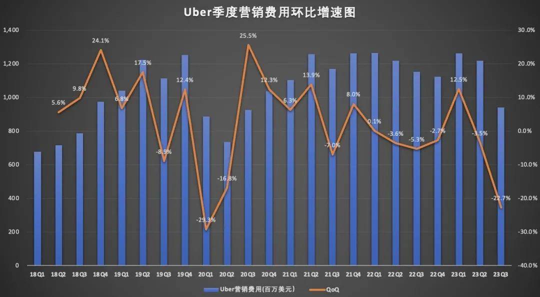 Uber营销费用的缩减最为明显。数据显示,Uber三季度的营销费用为9.41亿美元,同比减少18.4%,环比减少22.7%。