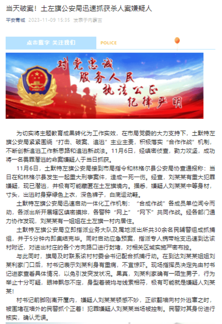 11月9日,呼和浩特“平安青城”官微发布消息表示,11月6日,当地发生一起重大刑事案,造成一死一伤,畏罪潜逃的命案嫌疑人当日被抓。