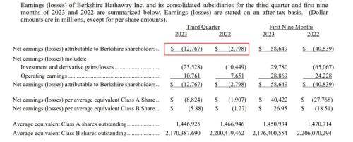 事实上的情况是:尽管Q3营业利润增长了40.6%,但伯克希尔净亏损增加了四倍多,达127.7亿美元,此前的一个季度净利润为+359.1亿美元。Q3出现了年内首度亏损。