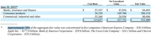 依据财报显示,伯克希尔的前五大重仓股在三季度未发生明显变化。截至9月30日,大约78%的股权投资公允价值集中在五家公司。