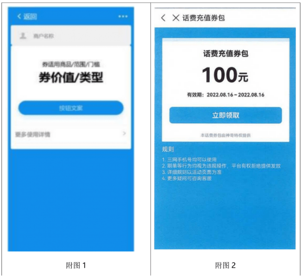 电商大促,有商家竟模仿“支付宝”的官方优惠券样式,在用户使用“支付宝”上的小程序时,批量投放领取100元话费券的广告页面,引导用户点击领取,从而链接、下载第三方软件。用户下了软件、付了款,得到的却不是100元话费,而是一堆5元的话费优惠券,且使用条件严苛,这让消费者大呼“上了支付宝的当”。