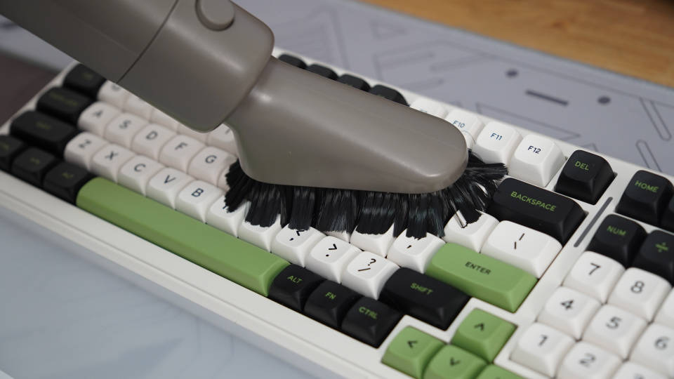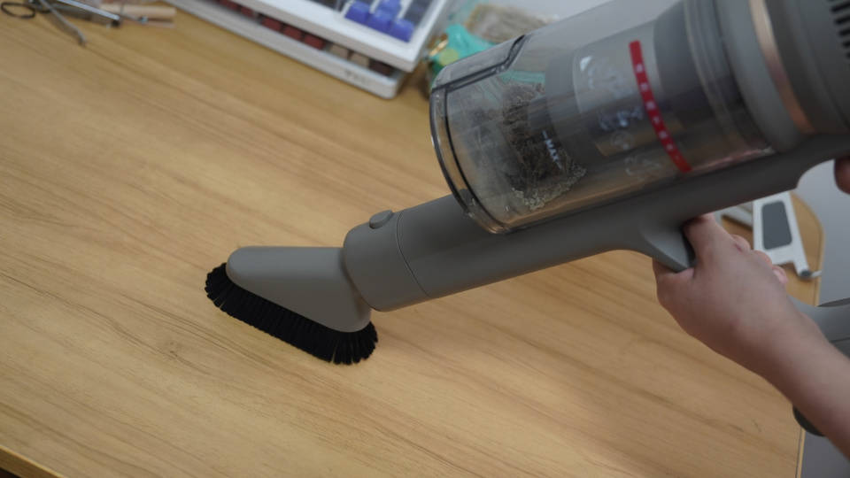 不仅如此,追觅Z10 Station还针对不同清洁场合搭配了不同的刷头,除了基础的刷头之外,我最喜欢的就是除尘软毛刷,它的刷头更为柔软,而且风道不长,可以轻松清理桌面,甚至是清理键盘缝隙,可以清理出非常多的垃圾,特别是掉落里面的头发,零食细小垃圾等。