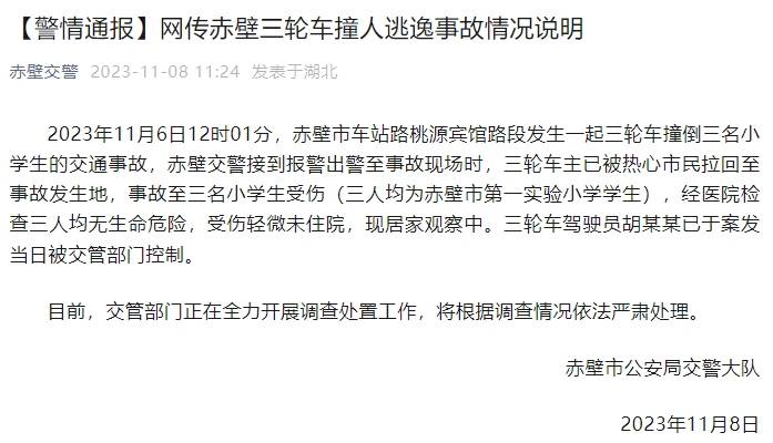 2023年11月6日12时01分,赤壁市车站路桃源宾馆路段发生一起三轮车撞倒三名小学生的交通事故,赤壁交警接到报警出警至事故现场时,三轮车主已被热心市民拉回至事故发生地,事故致三名小学生受伤(三人均为赤壁市第一实验小学学生),经医院检查三人均无生命危险,受伤轻微未住院,现居家观察中。三轮车驾驶员胡某某已于案发当日被交管部门控制。