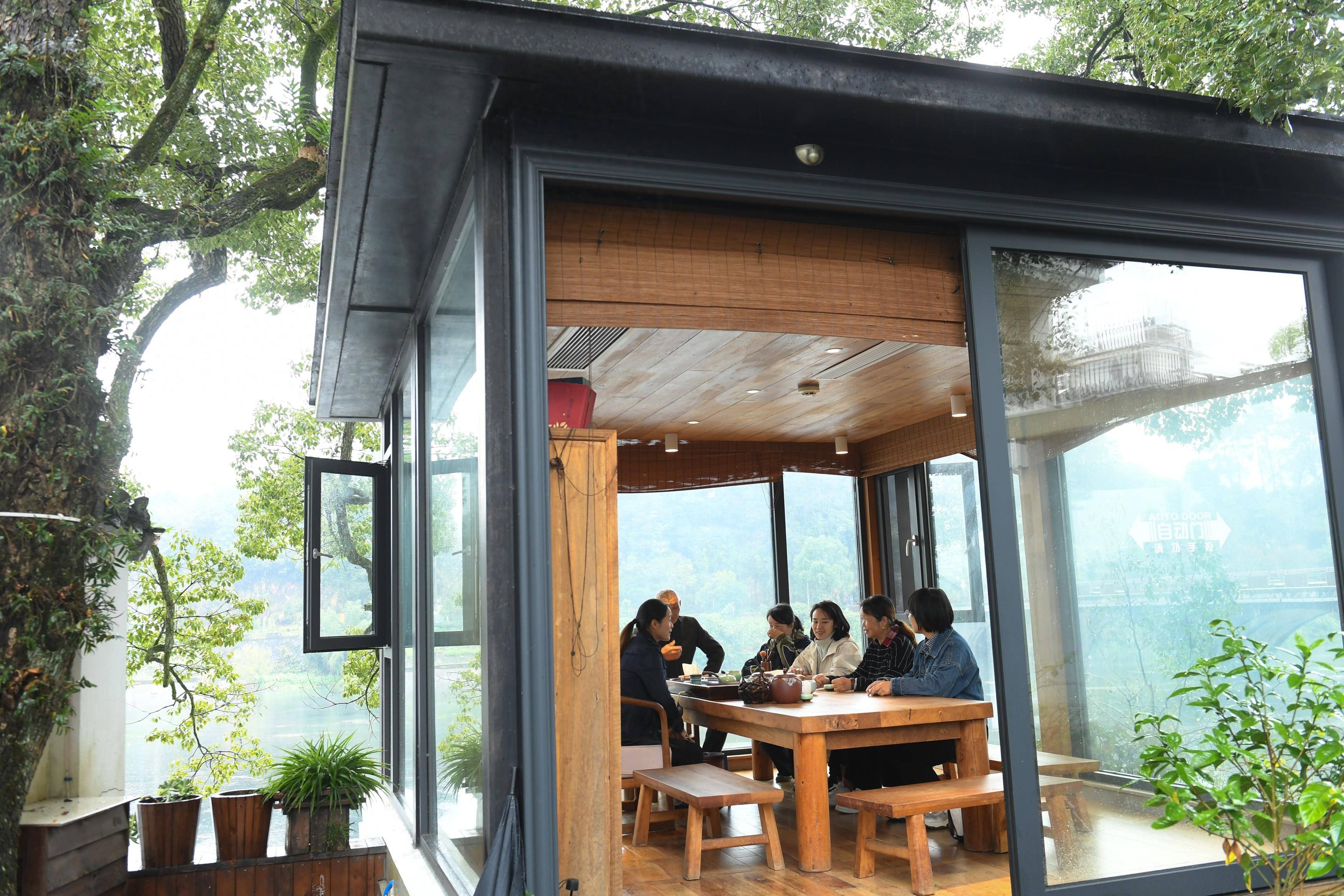 11月8日,在金星村一家民宿,客人们一边喝茶一边欣赏江畔美景。 新华社记者 翁忻旸 摄