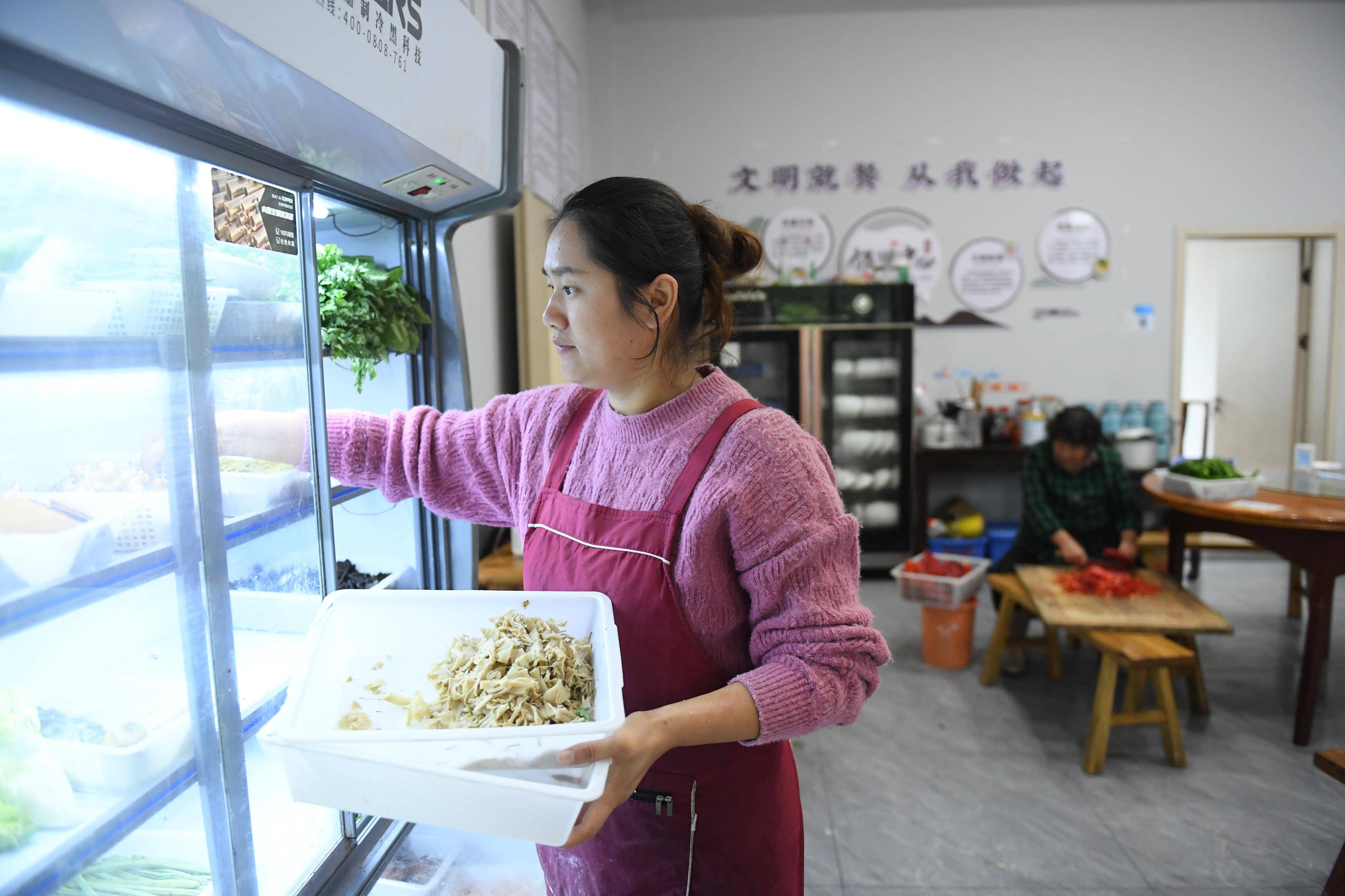 11月8日,工作人员在金星村共享食堂为村里的老人们准备午饭。 新华社记者 翁忻旸 摄