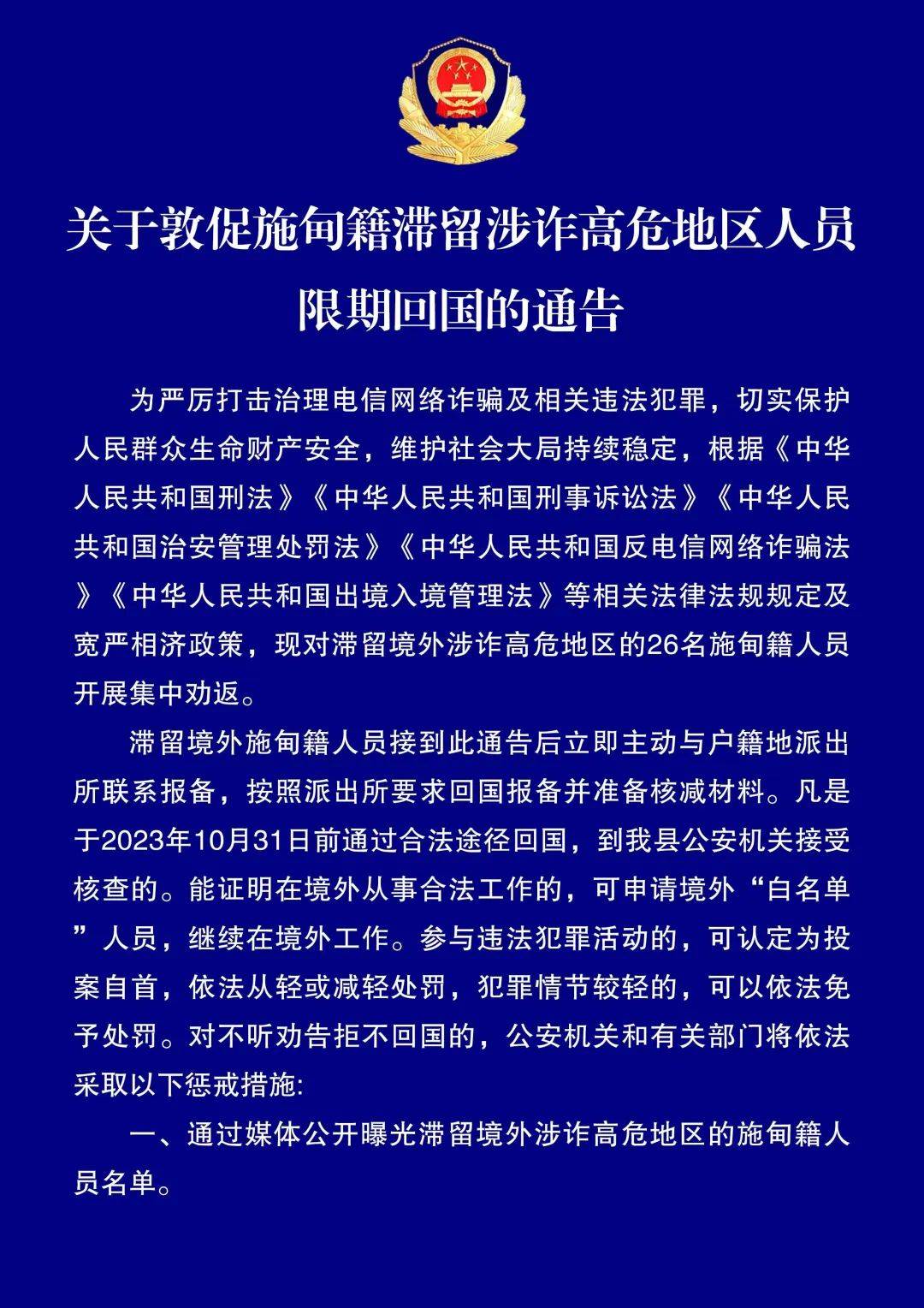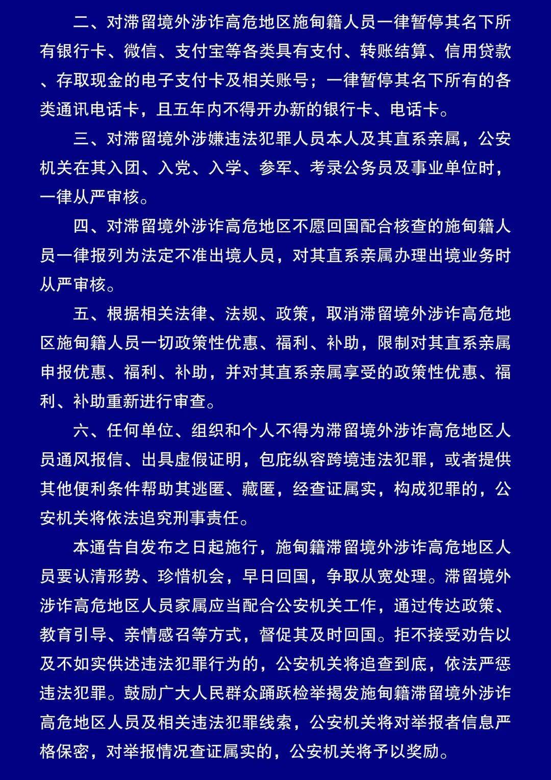 涉诈高危地区人员限期回国的通告