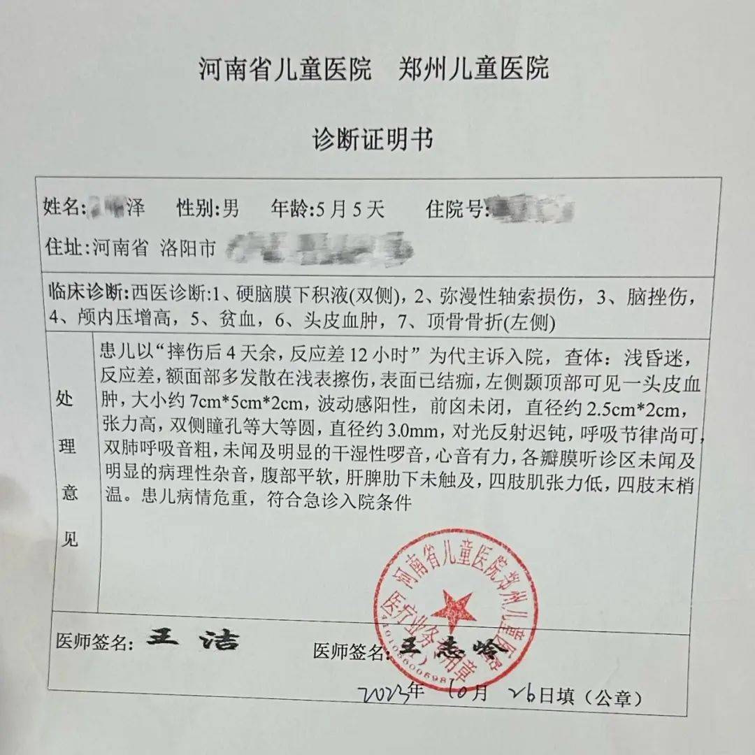 5个月大的小泽是个大眼睛、肉嘟嘟的男婴,在2023年10月21日上午,他被精神病发作的母亲从七八十度的陡坡上“推”下,脑袋上摔出七八道口子,有的地方皮肉外翻,满头满脸是血,他直接昏迷了过去。后小泽被河南省儿童医院收治,直接拉进入ICU抢救,入院短短几天,就已经欠了医院6万,接下来,小泽需要的开颅手术、促醒及康复治疗,费用在60万左右,这对小泽爸爸来说,是个天文数字。