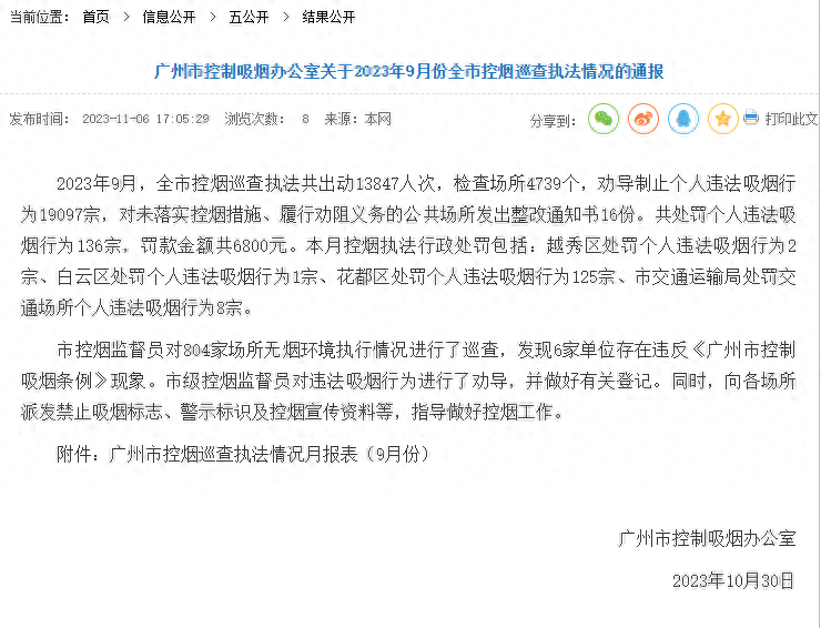 广州市控制吸烟办公室关于2023年9月份全市控烟巡查执法情况的通报