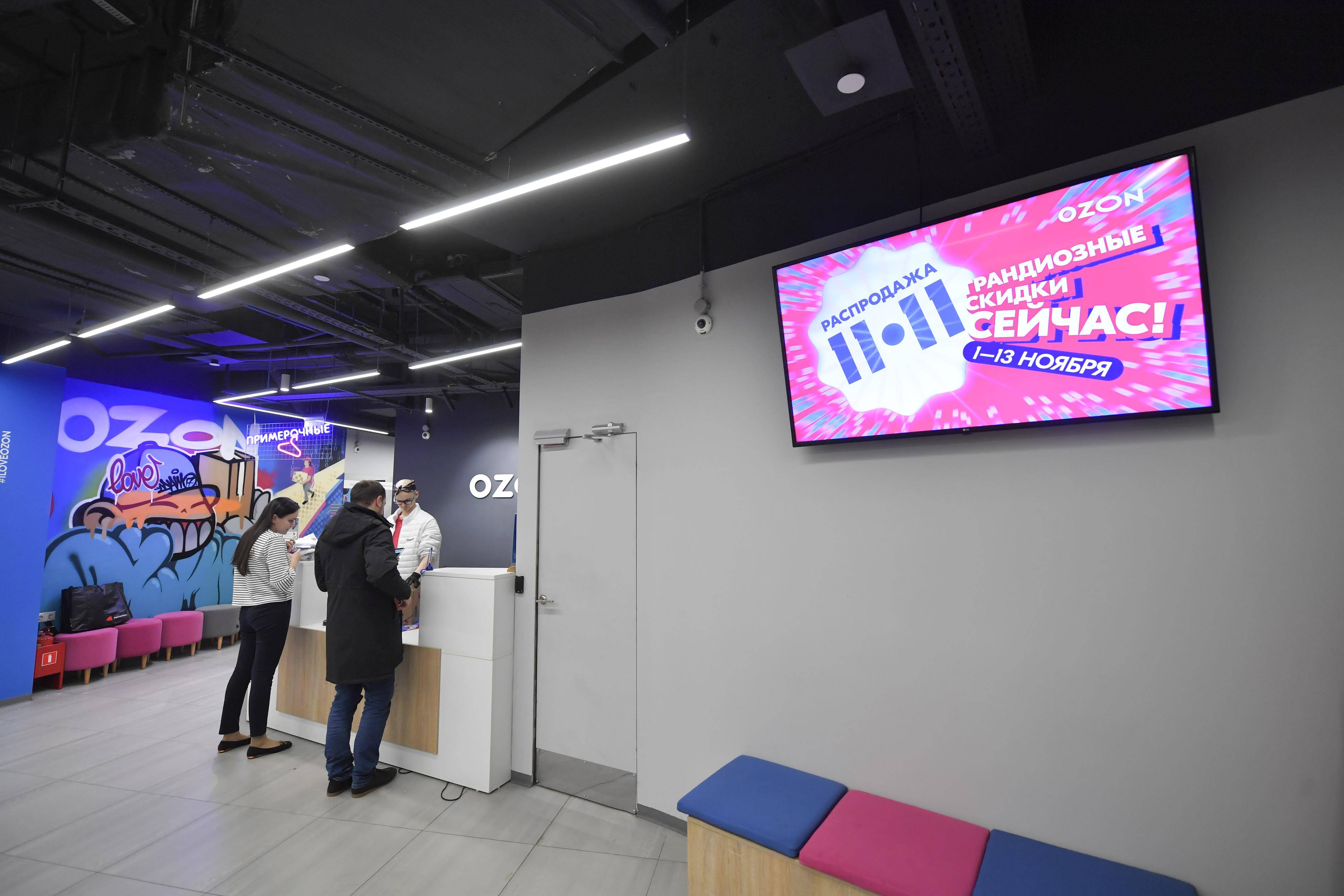 11月8日,在俄罗斯首都莫斯科,人们在一家播放“双十一”促销广告的电商平台取货点取货。 新华社发(亚历山大摄)