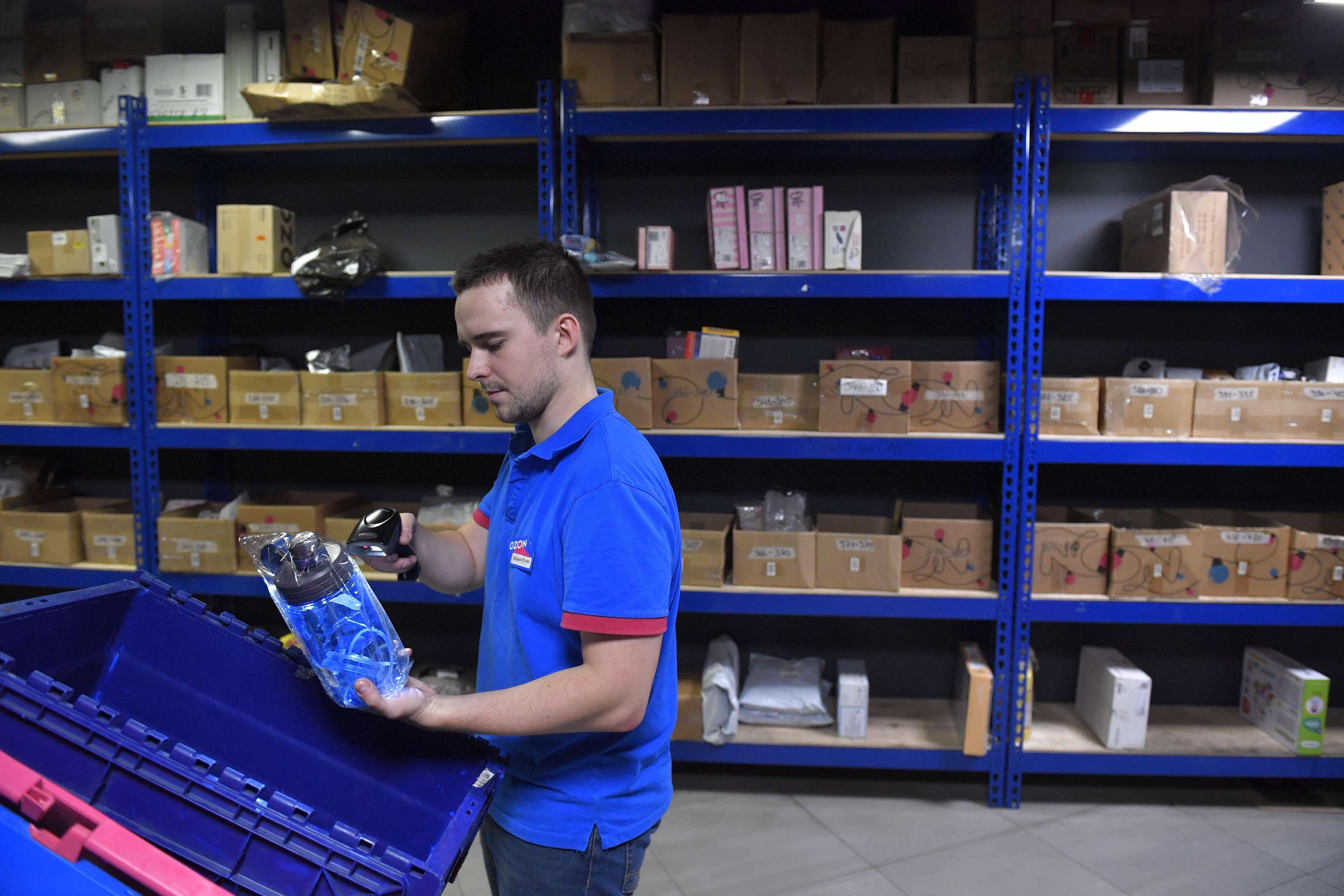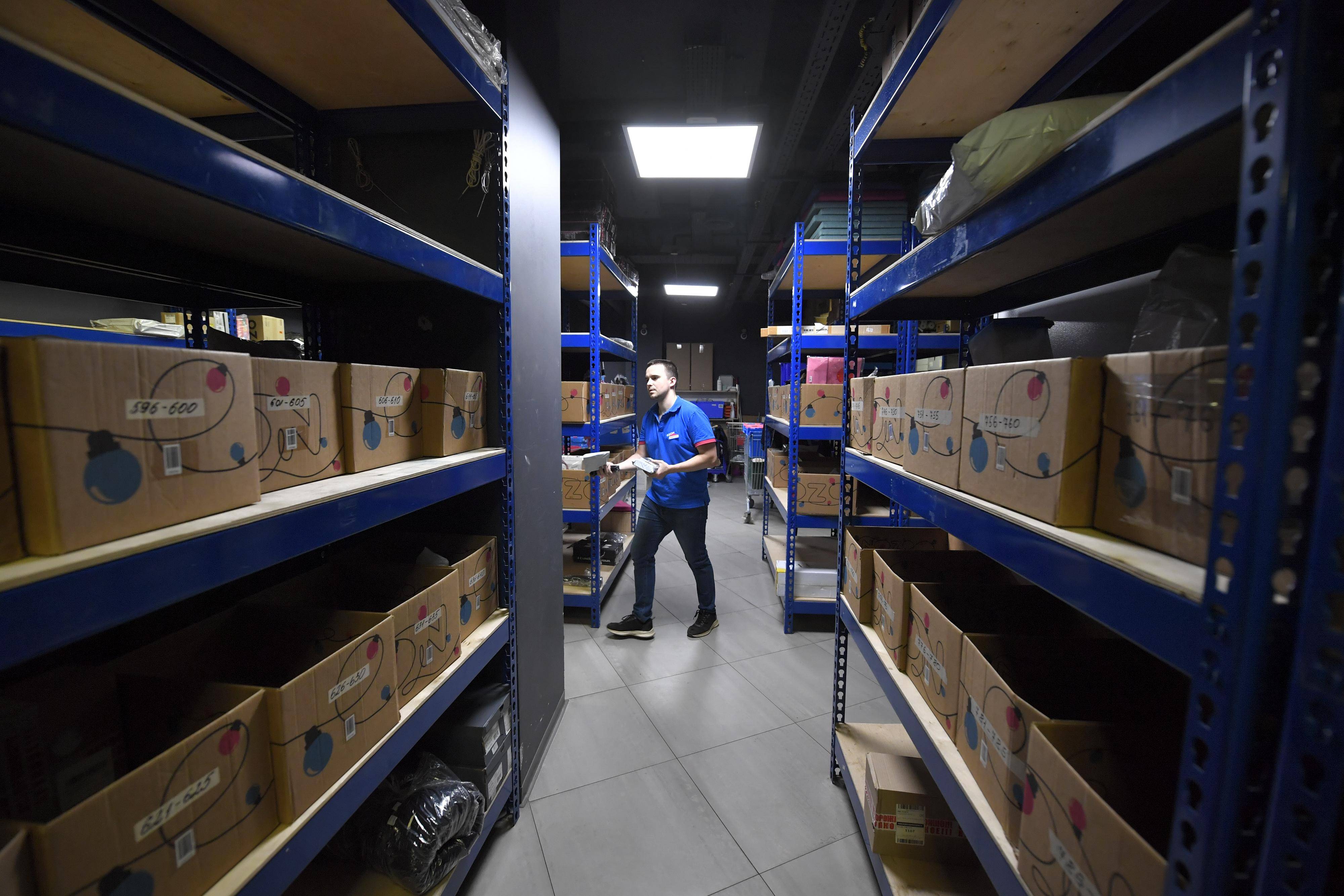 11月8日,在俄罗斯首都莫斯科,工作人员在一家电商平台仓库内分拣货物。 新华社发(亚历山大摄)