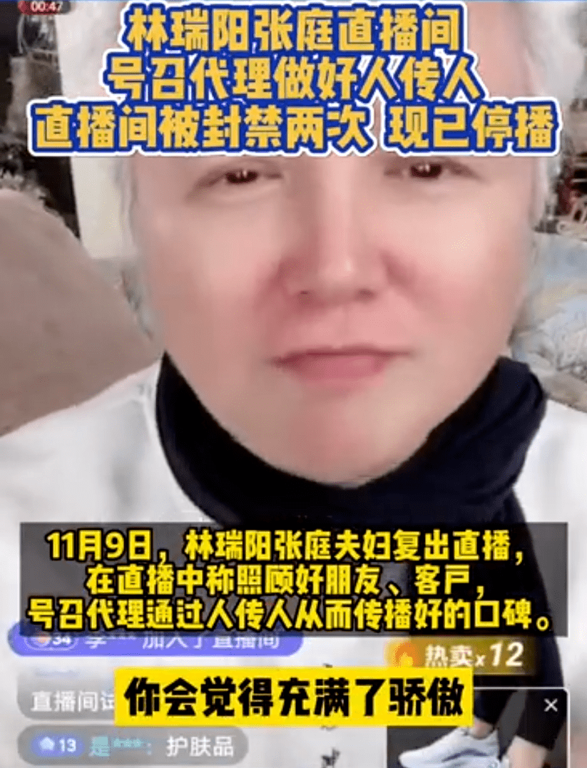 据蓝鲸财经报道,11月9日,林瑞阳张庭夫妇复出直播,在直播中称照顾好朋友、客户,号召代理通过人传人从而传播好的口碑。直播过程中直播间被封禁两次,目前已停止直播。