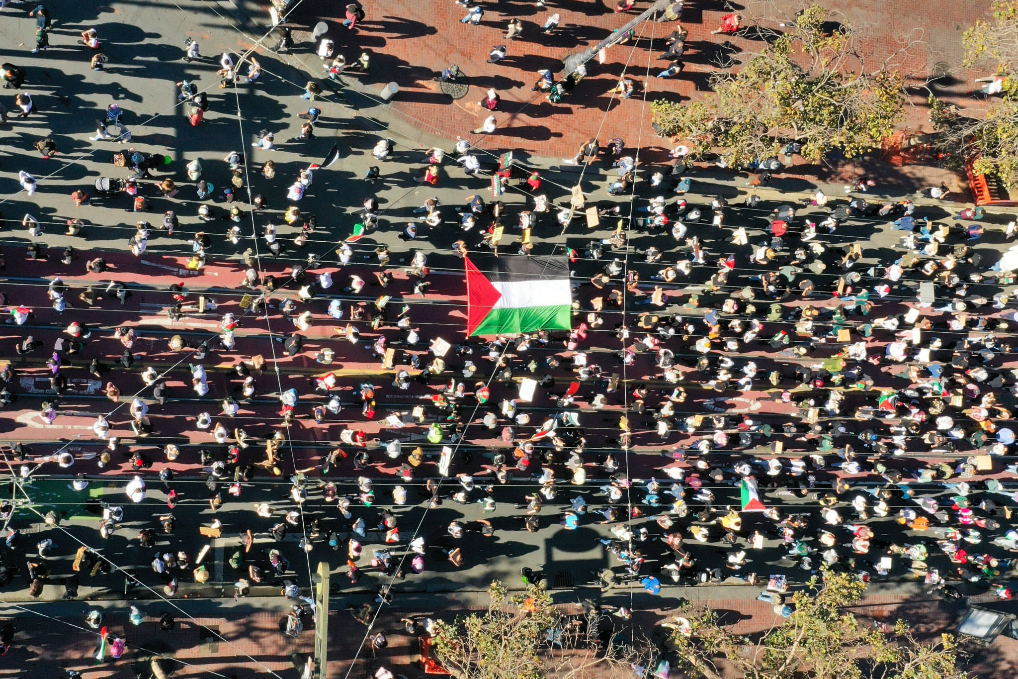 当地时间2023年10月28日,美国旧金山,大约1.5万人举行抗议活动,声援巴勒斯坦,并一度封锁了该市的高速路。 IC 图
