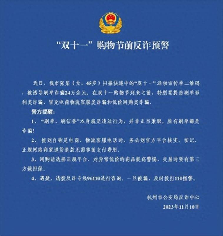 典型案例:2023年10月26日,张某(化姓,45岁)收到的快递中有一张“双十一”活动宣传单并扫码加入微信群,对方以返利为由让其刷单,被骗24万余元。