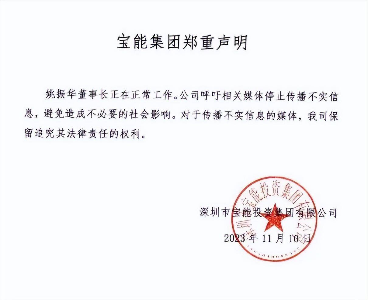 今天(10日)下午,宝能集团官方发声明表示:“姚振华董事长正在正常工作。公司呼吁相关媒体停止传播不实信息,避免造成不必要的社会影响。对于传播不实信息的媒体,我司保留追究其法律责任的权利。”