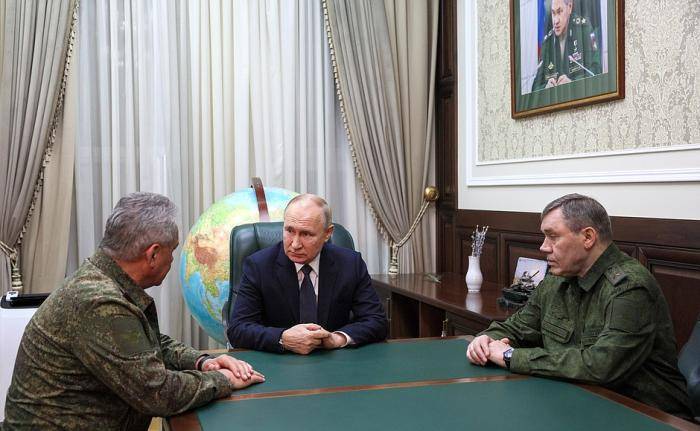 视察期间普京与俄国防部长绍伊古、俄武装力量总参谋长格拉西莫夫会面。图片来源:俄罗斯克里姆林宫网站