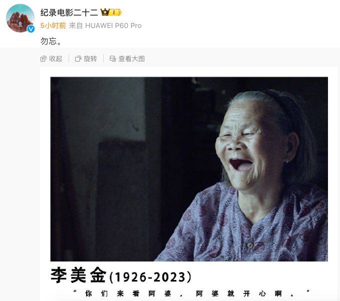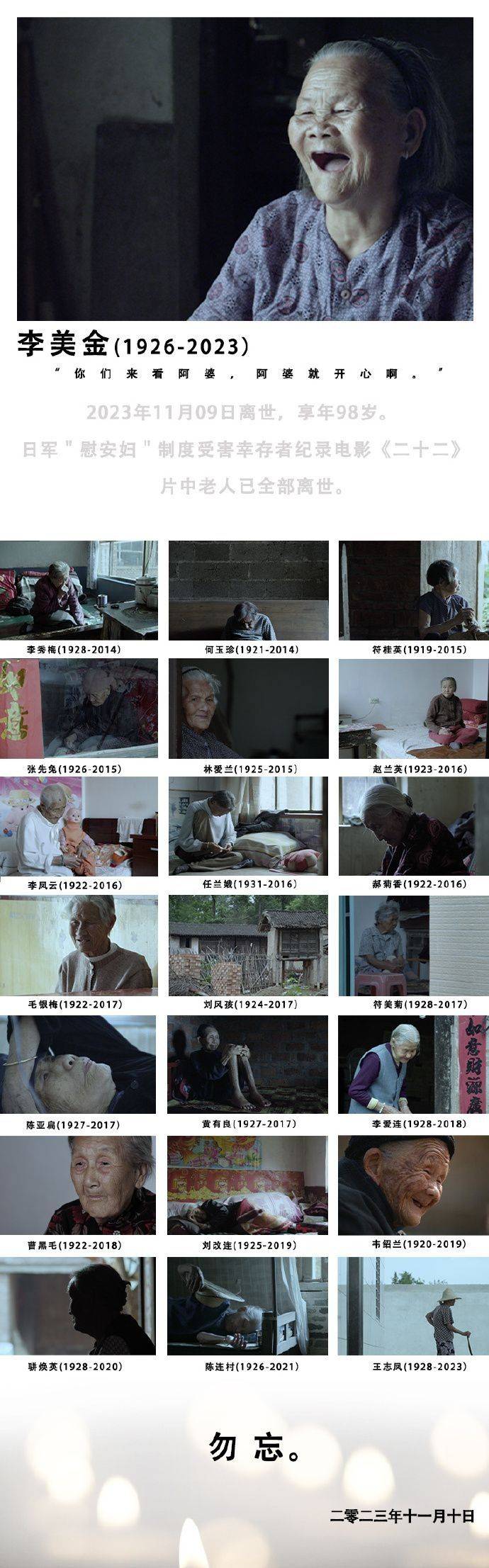 李美金老人的离世,让我们深感痛惜和敬意。她是那个时代的见证者,也是《二十二》这部珍贵纪录片中的重要角色。
