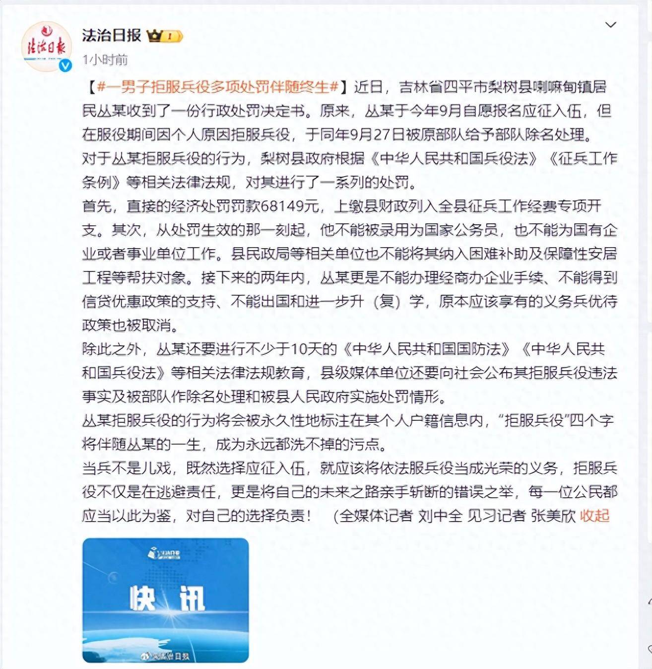近日,吉林省四平市梨树县喇嘛甸镇居民丛某收到了一份行政处罚决定书。原来,丛某于今年9月自愿报名应征入伍,但在服役期间因个人原因拒服兵役,于同年9月27日被原部队给予部队除名处理。