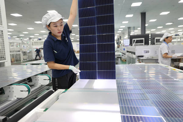 2023年8月28日,江苏连云港市赣榆经济开发区一家新能源企业,工人正在加紧生产一批出口海外的太阳能光伏电池组件。 图自IC Photo