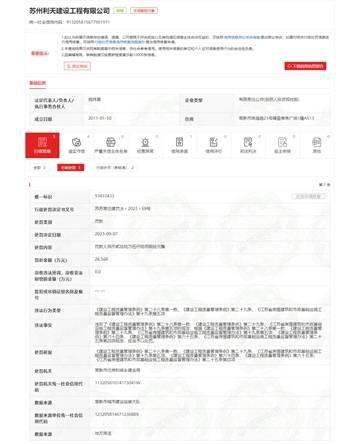9月7日,常熟市住房和城乡建设局作出苏苏常住建罚决﹝2023﹞69号处罚决定书,信用中国(江苏苏州)官网载明:苏州利天建设工程有限公司违反《建设工程质量管理条例》第二十八条第一款、《建设工程质量管理条例》第二十九条、《江苏省房屋建筑和市政基础设施工程质量监督管理办法》第十九条第五项,处罚款26.568万元。