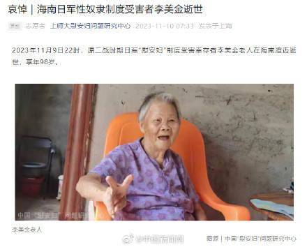 2023年11月9日22时,原二战时期日军“慰安妇”制度受害幸存者李美金老人在海南澄迈逝世,享年98岁。李美金阿婆生前是纪录片《二十二》中在世的最后一位主人公。截至目前,经研究中心调查确认的中国大陆地区登记在册的日军“慰安妇”制度受害幸存者还剩9人。( 上师大慰安妇问题研究中心)