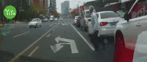 图:老年人在车流中横穿道路,不幸被车辆撞倒。