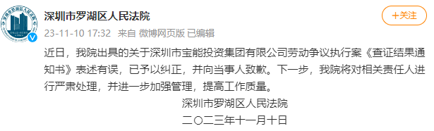 近日,一份深圳市罗湖区人民法院的《查证结果通知书》在网上流传,事涉宝能及其实控人姚振华。针对这一消息,@深圳市罗湖区人民法院官方微博于11月10日下午发布情况说明:近日,我院出具的关于深圳市宝能投资集团有限公司劳动争议执行案《查证结果通知书》表述有误,已予以纠正,并向当事人致歉。下一步,我院将对相关责任人进行严肃处理,并进一步加强管理,提高工作质量。