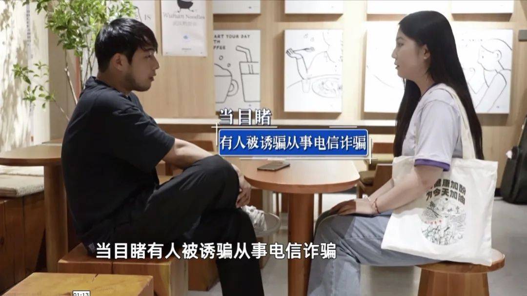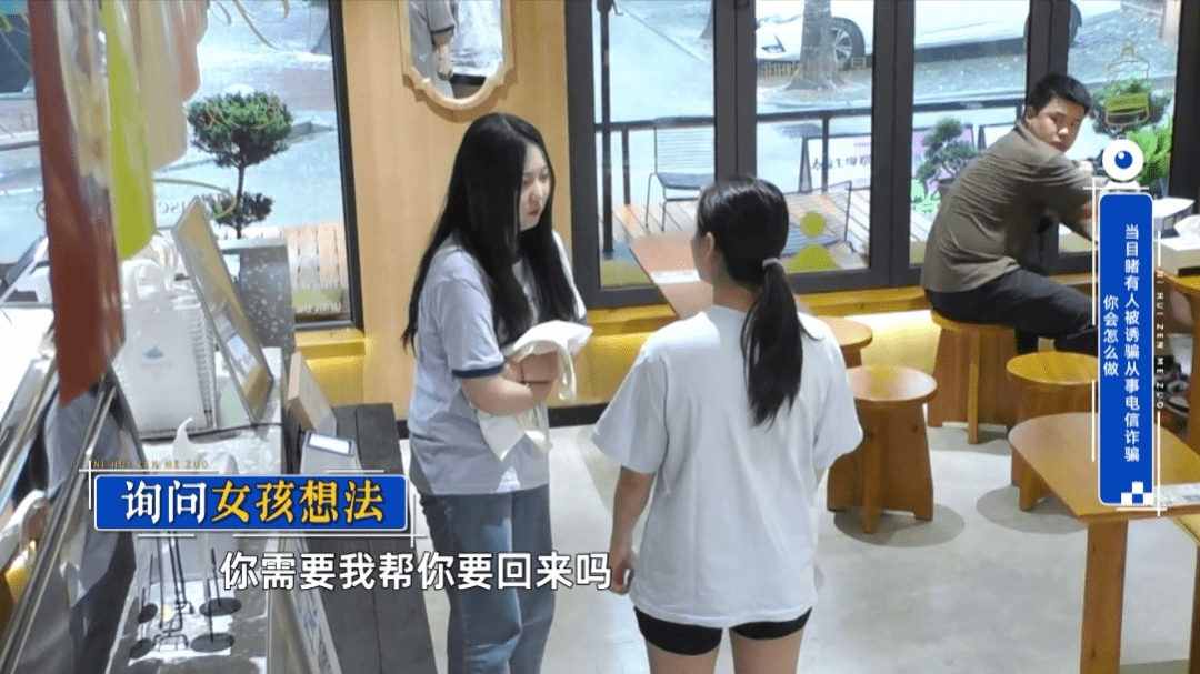 第一组观察中,从事电信诈骗的男子正在向前来面试的女生简单介绍工作内容,他表示每天只需要打打电话,和客户联络好感情就可以,只要客户下单,就可以拿到将近一半的高额提成,但殊不知所谓的和客户联络感情,其实是电信诈骗的一种形式,如此高的提成,也引起了旁桌客人的关注。女孩沉浸在赚钱的幻想中,完全没有意识到危险,但当男子将手机和身份证从她手中拿走时,她开始警觉犹豫起来,旁观群众见此如坐针毡,他们在商量了对策之后,立马起身帮助求职女孩拿回身份物品。从一开始的劝告到最后语气强硬的警告,旁桌女生面对电诈分子也丝毫不惧,最后以报警作为警示,顺利拿回了身份证和手机。即便眼前的危险已经解除,女生还是忍不住的叮嘱着。在后续采访中这位廖女士说道:“刚毕业确实对这种事情没有经验,如果她受到什么伤害或虐待是无法挽回的,这种教训还是不必要让她去经历。”