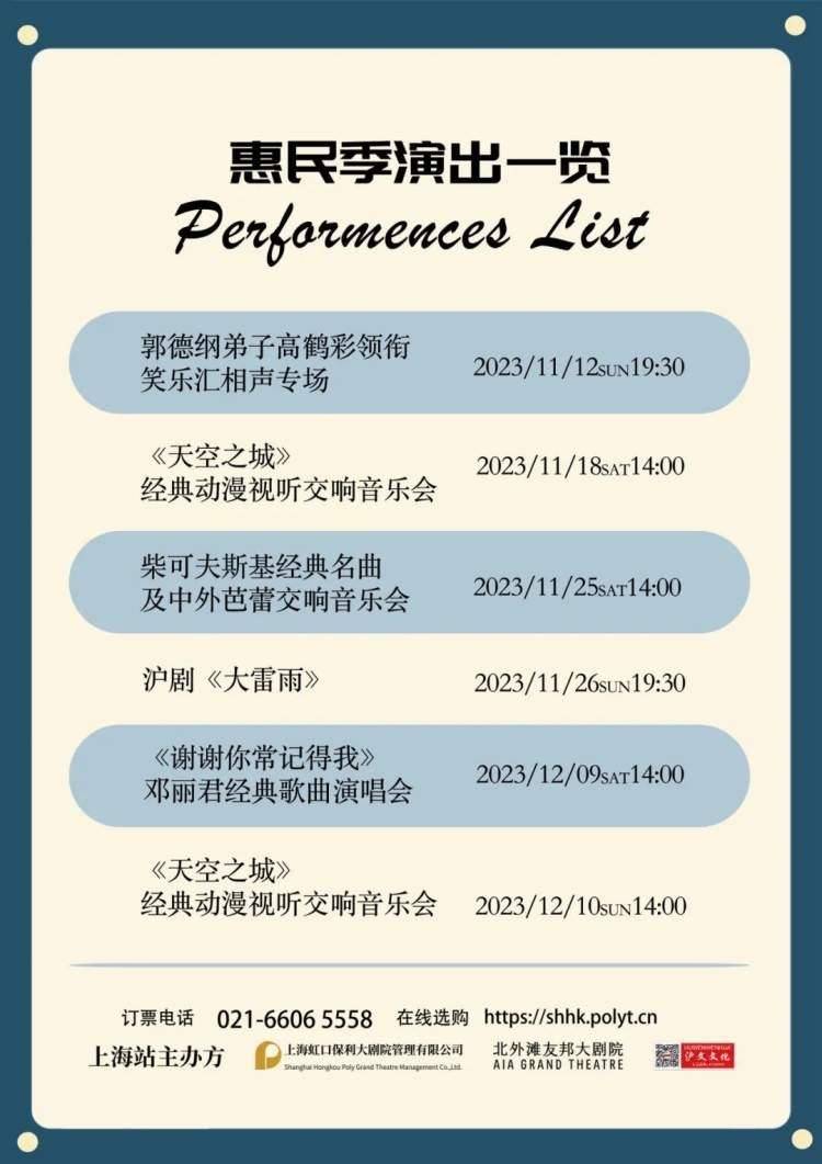 随着本周日笑乐汇专场演出的举行,北外滩友邦大剧院为期一整个月的文化惠民季系列演出也即将开启。届时,从11月12日到12月10日,几乎每周末都会有公益场的演出上演,最高票价仅需80元。