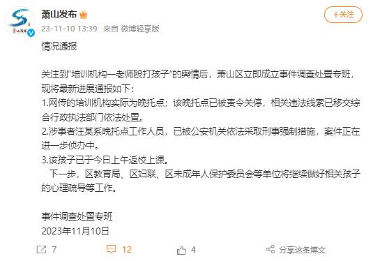 关注到“培训机构一老师殴打孩子”的舆情后,萧山区立即成立事件调查处置专班,现将最新进展通报如下: