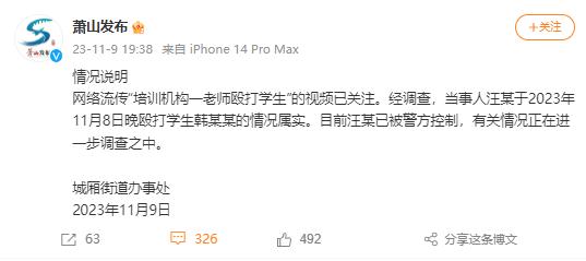 网络流传“培训机构一老师殴打学生”的视频已关注。经调查,当事人汪某于2023年11月8日晚殴打学生韩某某的情况属实。目前汪某已被警方控制,有关情况正在进一步调查之中。