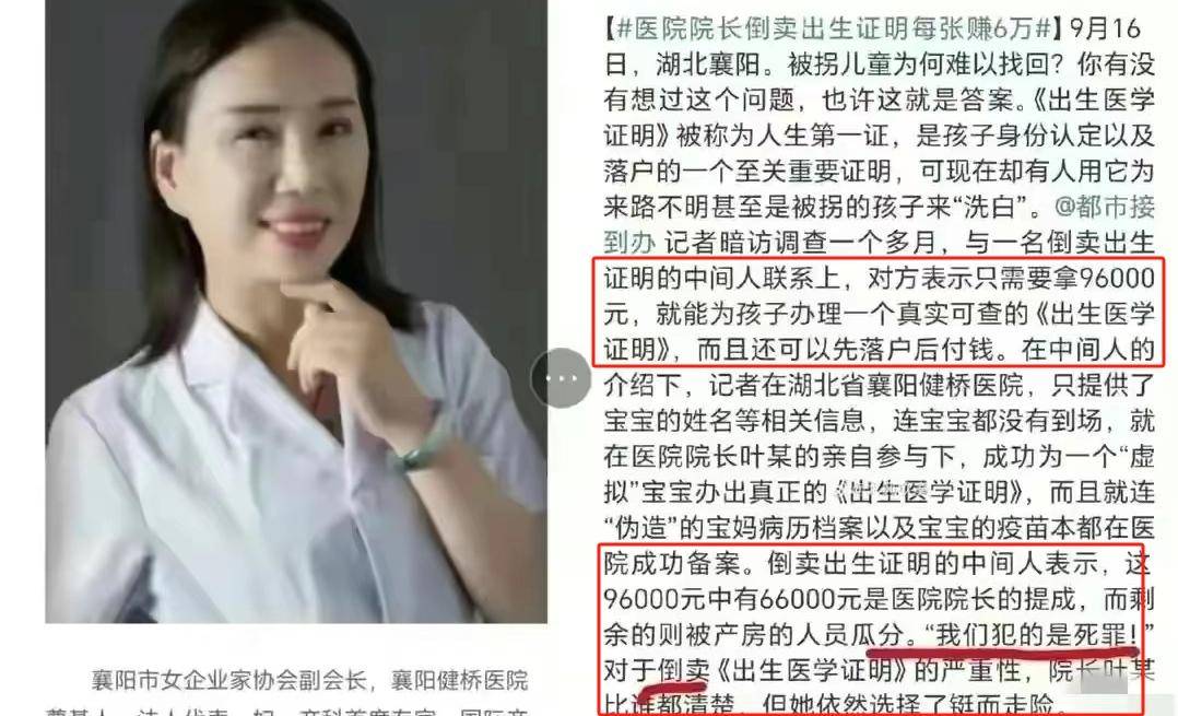 湖北某医院的院长叶有芝,被爆料牵扯违法贩卖出生证明,引起大家的关注。