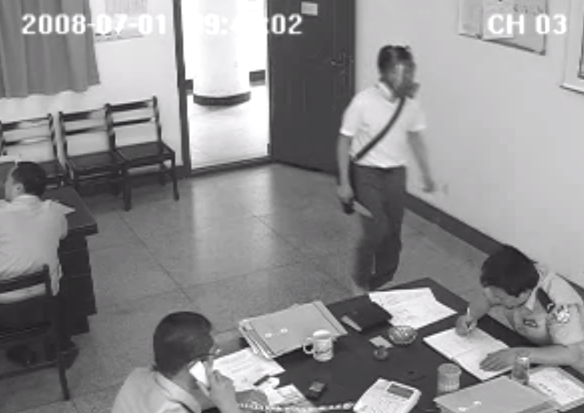 接下来,杨佳一手持刀,一手拿着催泪瓦斯,直接从底楼大厅过道一路冲进了办公区域。