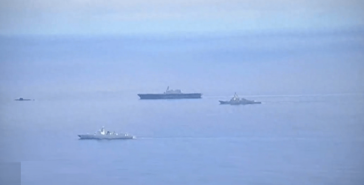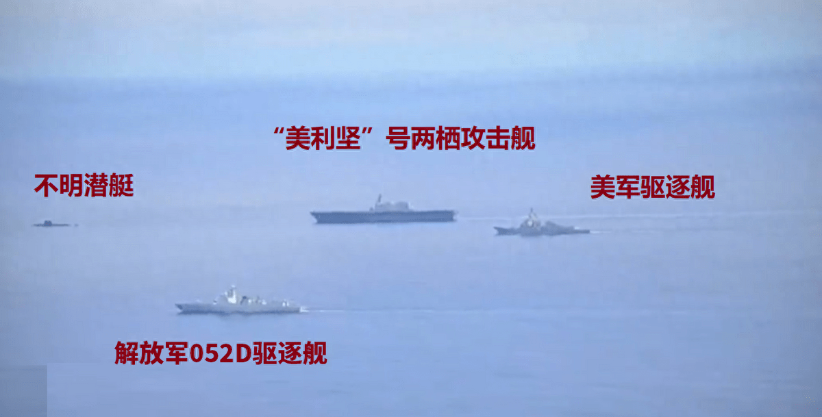 从加拿大电视台公布的现场画面,中间是“美利坚”号两栖攻击舰(LHA-6),可以搭载F-35B垂直起降隐身战机;后面紧紧跟着一艘“阿利伯克”驱逐舰,前面是一艘不明国籍和型号的潜艇,而画面最近的地方,就是中国人民解放军的一艘052D驱逐舰。