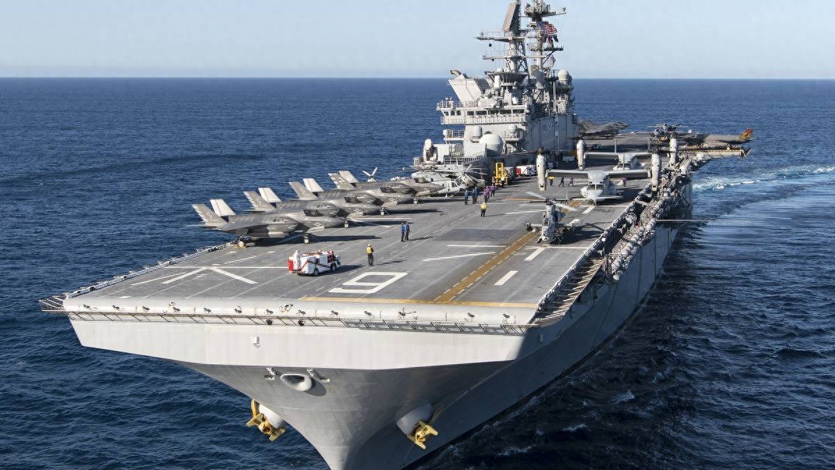 这次派来的“美利坚”号两栖攻击舰,其实是一艘中型航母,排水量4万5千吨,完全取消了船坞,没有气垫登陆艇,全靠飞机来投送兵力。它可以搭载20架F-35B隐身战斗机,也可以搭载30多架直升机,比如MV-22“鱼鹰”倾转旋翼机、CH-53K“超级种马”重型直升机。“美利坚”号还能搭载1900名陆战队员,相当于一个团的兵力,用空中突击的方式,插向对手的后方纵深。