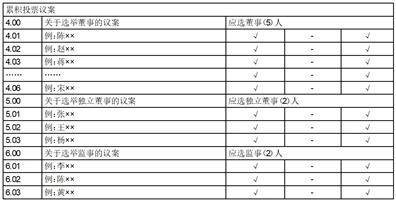 某投资者在股权登记日收盘时持有该公司100股股票,采用累积投票制,他(她)在议案4.00“关于选举董事的议案”就有500票的表决权,在议案5.00“关于选举独立董事的议案”有200票的表决权,在议案6.00“关于选举监事的议案”有200票的表决权。
