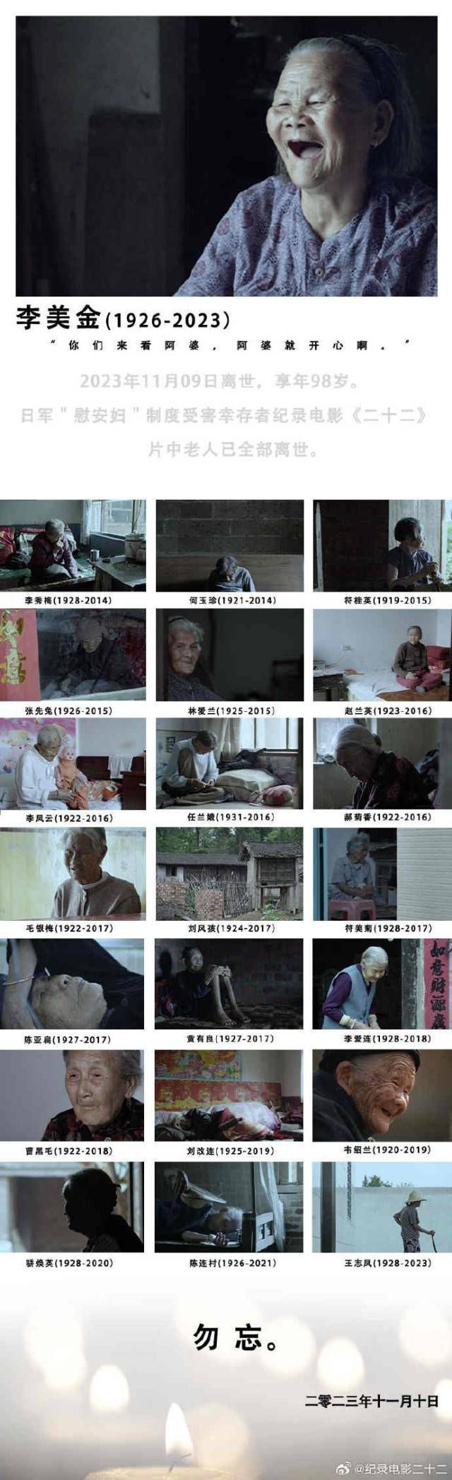 据悉,李美金阿婆生前是纪录片《二十二》中在世的最后一位主人公。截至目前,经研究中心调查确认的中国大陆地区登记在册的日军“慰安妇”制度受害幸存者还剩9人。