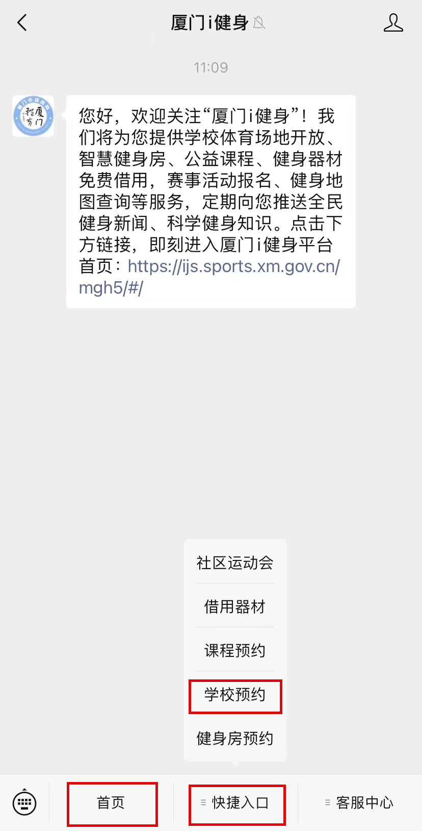 ①关注“厦门i健身”,进入“首页”(也可直接进入“快捷入口”—“学校预约”)。