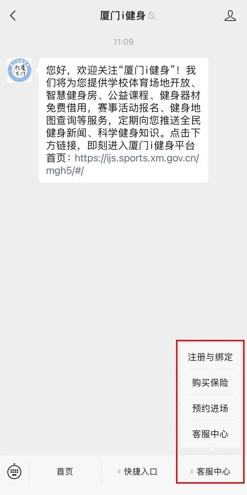 ④您还可以点击“厦门i健身”公众号“客服中心”入口,获取“注册与绑定”、“购买保险”、“预约进场”等详细攻略。如有问题也可拨打客服热线5111880咨询。